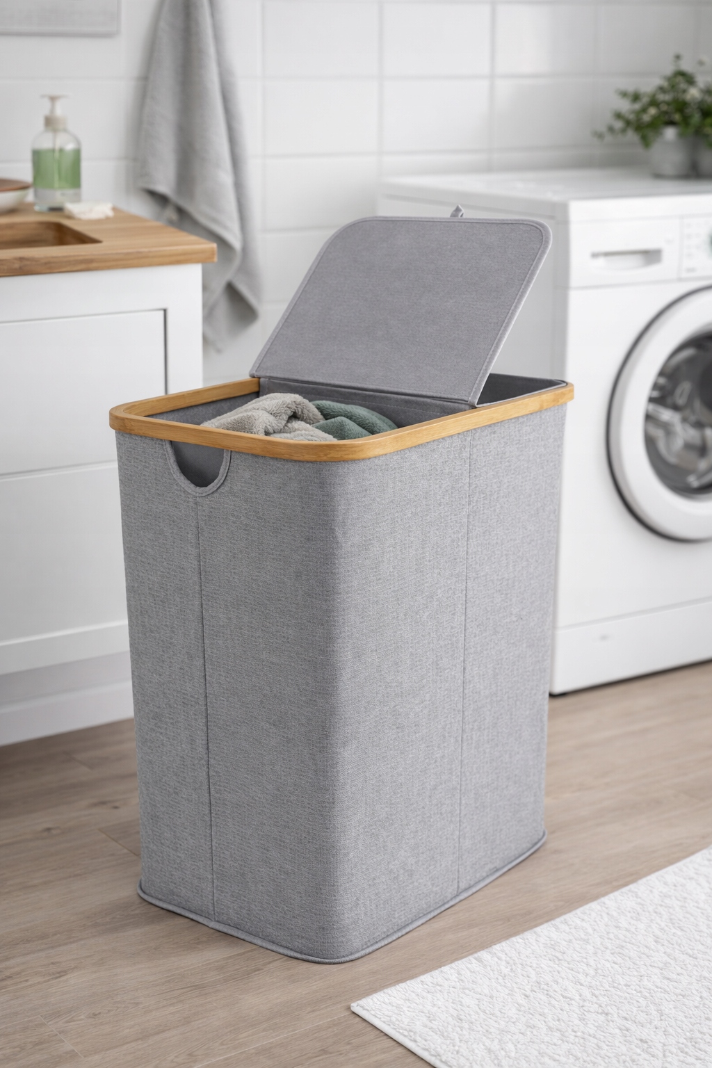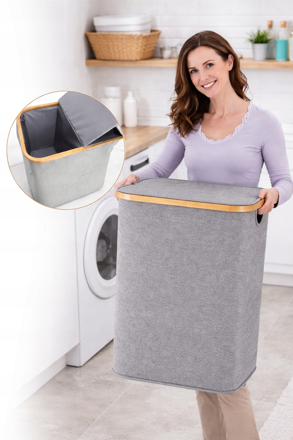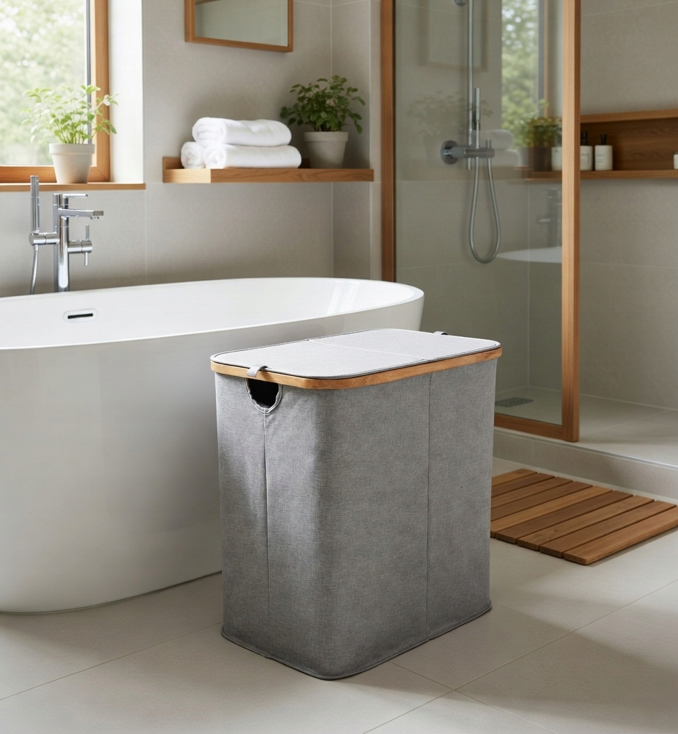 ✅Praktyczny kosz na pranie z elementami bambusa.